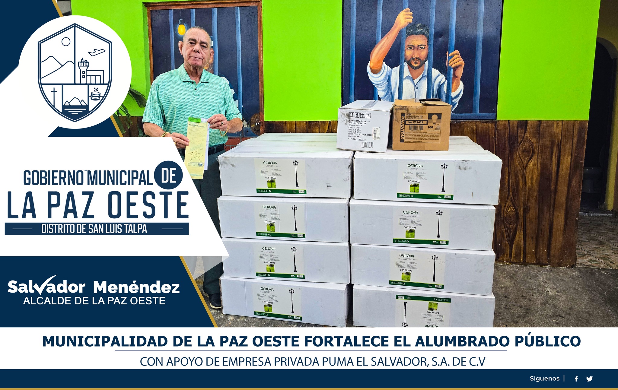 Publicado enSan Juan Talpa San Luis Talpa Municipalidad de La Paz Oeste fortalece el alumbrado público con apoyo de empresa privada Puma El Salvador, S.A. de C.V Como Gobierno Municipal de La Paz Oeste reafirmamos nuestro compromiso con el desarrollo territorial mediante la articulación de… marzo 20, 2026
